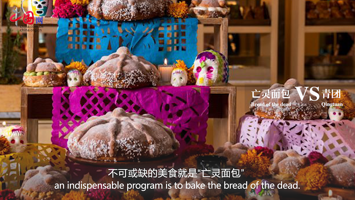 而在中國(guó)人看來(lái),骷髏多少有點(diǎn)兒“嚇人”。中國(guó)清明節(jié)的傳統(tǒng)美食是“青團(tuán)”,采用青艾汁液拌進(jìn)糯米粉里,包裹豆沙餡而成。青團(tuán)寓意著團(tuán)圓,也是為了紀(jì)念先人,表達(dá)思念。