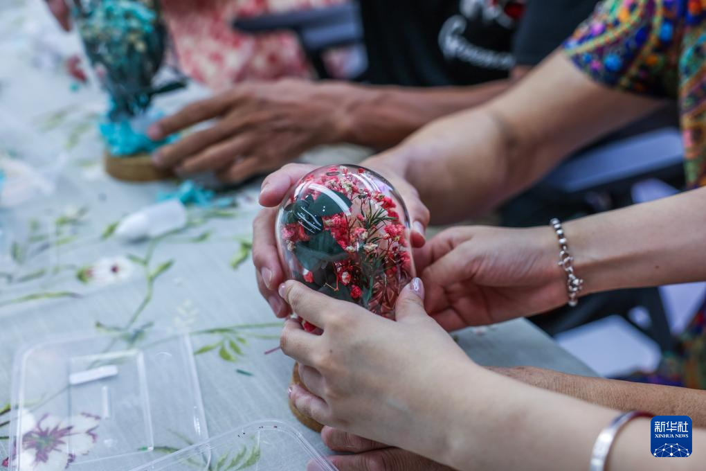 8月6日,龍泉街道西白魚潭社區(qū)居民在制作永生花。