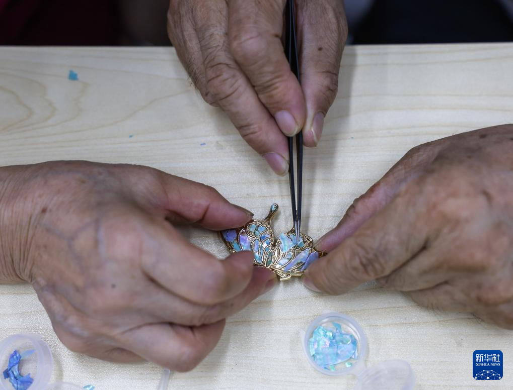 8月6日,龍泉街道潛莊社區(qū)居民在制作七彩螺鈿蝴蝶胸針。