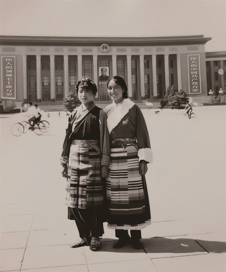 二十世紀(jì)70年代,加央卓瑪(左)和姐姐在北京人民大會(huì)堂前合影。受訪者供圖