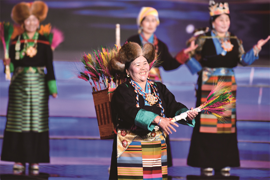 在拉薩市2026年春節(jié)藏歷火馬新年聯(lián)歡會(huì)現(xiàn)場(chǎng),阿佳央金和農(nóng)牧民婦女一起帶來(lái)了“村T”走秀。趙振宇 攝