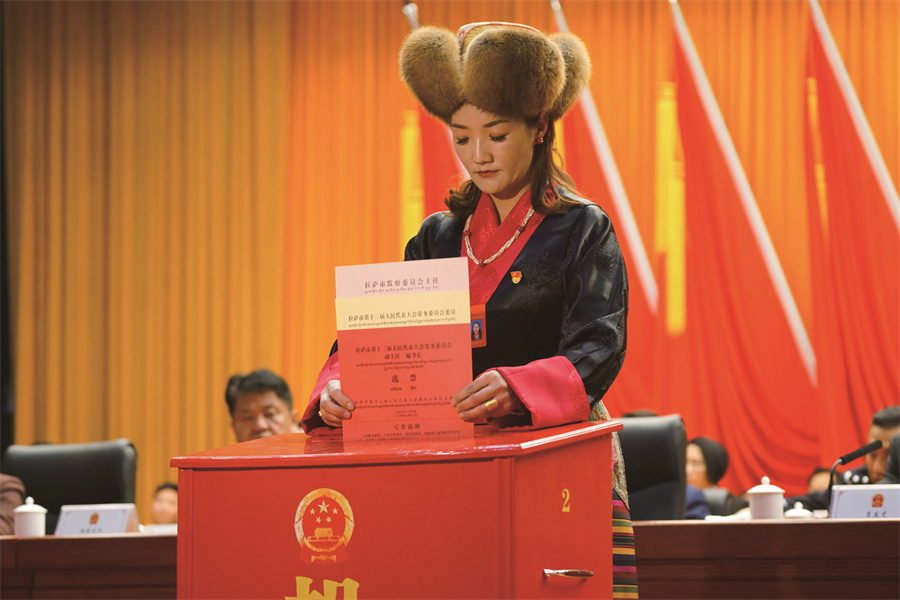 在拉薩市兩會上,人大代表投下神圣的一票,行使當(dāng)家作主的權(quán)利。趙振宇 攝