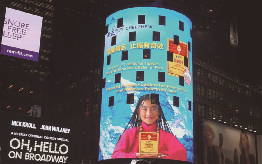 奇正藏藥廣告登上美國(guó)紐約時(shí)代廣場(chǎng)納斯達(dá)克大屏幕,向世界展示藏醫(yī)藥。受訪者供圖