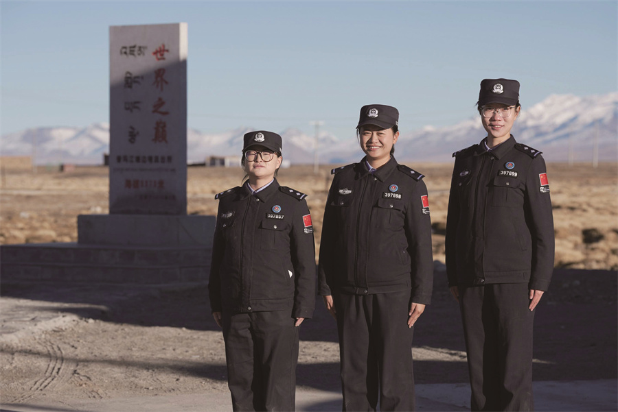 普瑪江塘三位女警在“世界之巔”石碑前合影,左起:李天嬌、李紅炎、武慧。