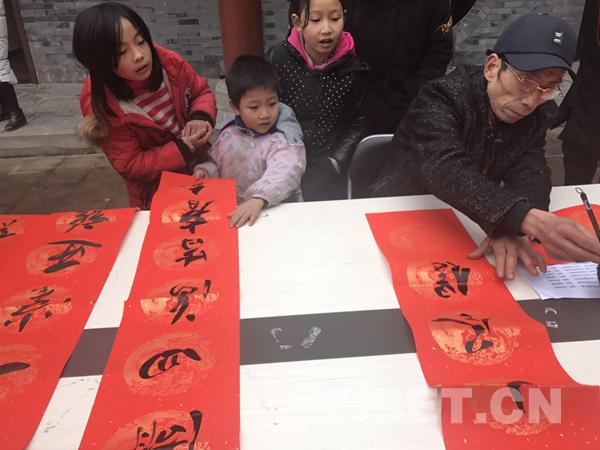 1月26日,2018年“新時代、新夢想”全國網(wǎng)絡(luò)媒體新春走基層活動(四川站)媒體團(tuán)走進(jìn)廣安市前鋒區(qū)代市鎮(zhèn)會龍村。記者們走過一排排獨(dú)具川東民居特色的房屋,看到一群中老年人正在寬敞的空地上跳著廣場舞,不遠(yuǎn)處的村民活動站內(nèi),幾位六七十歲的老大爺正聚在一起拉著二胡唱著歌,不遠(yuǎn)處支起一張長長的桌子,一位老人正在為村民們寫著春聯(lián),“現(xiàn)在眼看著日子好起來了,大家都搬進(jìn)了新房??爝^年了,我在這給大伙免費(fèi)寫春聯(lián),添添喜氣?,F(xiàn)在我也有徒弟了,村上好幾個人平常有空了都來跟我學(xué)學(xué)寫字啥的?!狈接烂骼先诉厡懽诌厡τ浾哒f道。眼前這番景象,很難讓人將會龍村和貧困村聯(lián)系在一起。