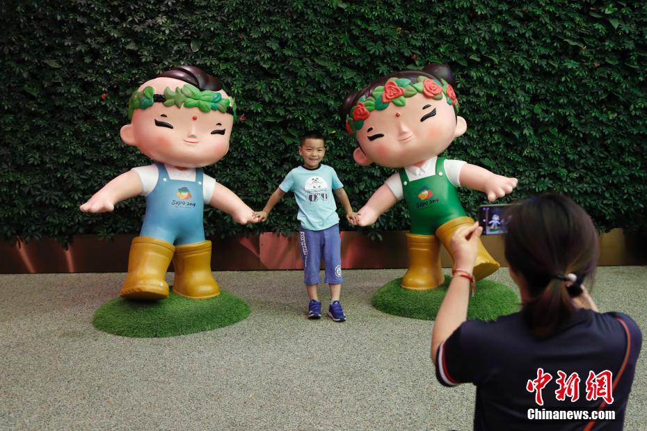 6月6日,2019年中國北京世界園藝博覽會舉辦中國國家館日活動。圖為一名兒童在中國館內(nèi)與吉祥物合影留念。中新社記者 韓海丹 攝
