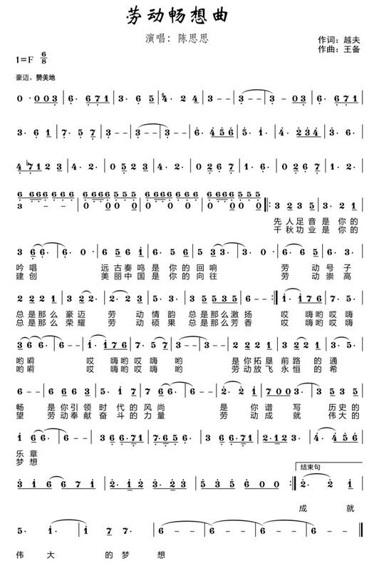 為慶祝2019年“五一”國際勞動節(jié),向新中國成立70周年獻禮,中華全國總工會組織力量專門為“五一”特別節(jié)目創(chuàng)作了主題歌《勞動暢想曲》。此作品采用藝術(shù)手法,深刻釋讀了勞動推動歷史發(fā)展,亦催生人類自身的科學真諦,熱情謳歌了勞動最光榮、勞動最崇高、勞動最偉大、勞動最美麗的社會風尚,由衷抒發(fā)了對祖國和人民特別是對我們黨和工人階級的深厚情感。