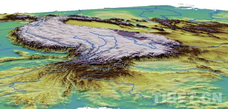 青藏高原衛(wèi)星圖片上,藍(lán)色的水系是根據(jù)原始數(shù)據(jù)繪制的。自右至左為:黃河,金沙江—長(zhǎng)江,瀾滄江—湄公河,怒江—薩爾溫江,雅魯藏布江—布拉馬普特拉河,獨(dú)龍江—伊洛瓦底江。左上角阿里境內(nèi)的獅泉河、象泉河、孔雀河等外流河,分別成為印度河、恒河的源頭或上源支流 楊經(jīng)綏/供圖