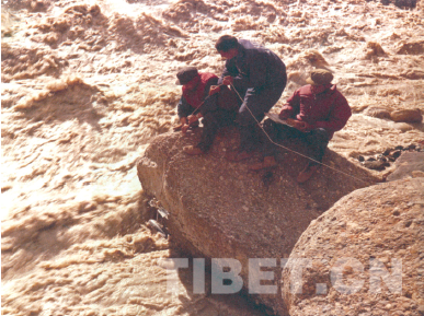 從勒布角到僧瀑布,完全沒(méi)有路,要在懸崖峭壁區(qū)走上一天。某些路段之險(xiǎn),那才叫觸目驚心!有一段十幾米長(zhǎng)的花崗巖陡壁,距離江面數(shù)百米,偵察兵先行,在懸崖兩端打進(jìn)巖石錐,拴牢一根25米長(zhǎng)的尼龍保險(xiǎn)繩。不過(guò),要是膽量不夠,即使有繩索也難移寸步。據(jù)說(shuō)某位專家都挪到半道了,雙腿發(fā)抖不聽(tīng)使喚,“擱”那兒了。藏族民工見(jiàn)狀,即刻返回,勇敢地趴在石壁上,硬是用手托住那人的腳,助其移步安全地帶。