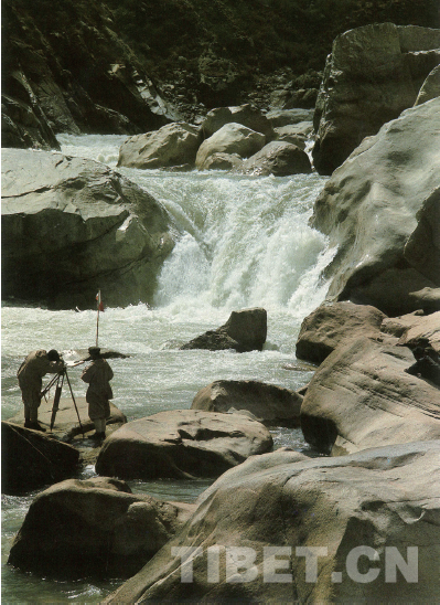 雅江考察任務(wù),除對(duì)水文特征——河道、流量、泥沙、水化學(xué)、洪枯水位等等進(jìn)行調(diào)查外,還負(fù)有水能資源及其合理開(kāi)發(fā)利用、開(kāi)發(fā)方式和工程條件的評(píng)價(jià)職責(zé)。關(guān)志華從地形圖和航拍照片上、從當(dāng)?shù)卦L問(wèn)中得知,桑日—加查峽谷中有兩大瀑布,決定前往探察。為確保安全,山南地區(qū)及駐軍派出藏族向?qū)Ш陀?xùn)練有素的偵察兵隨行。