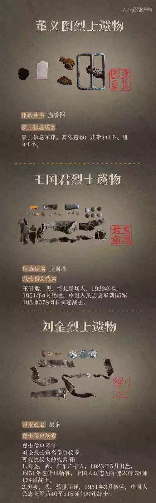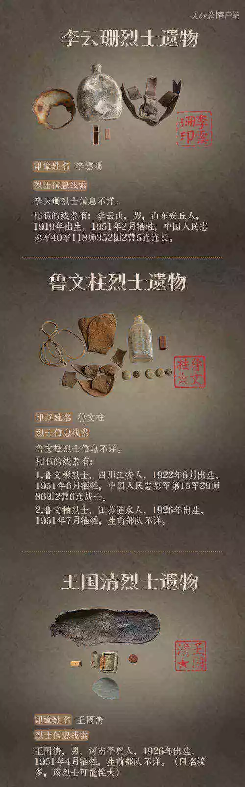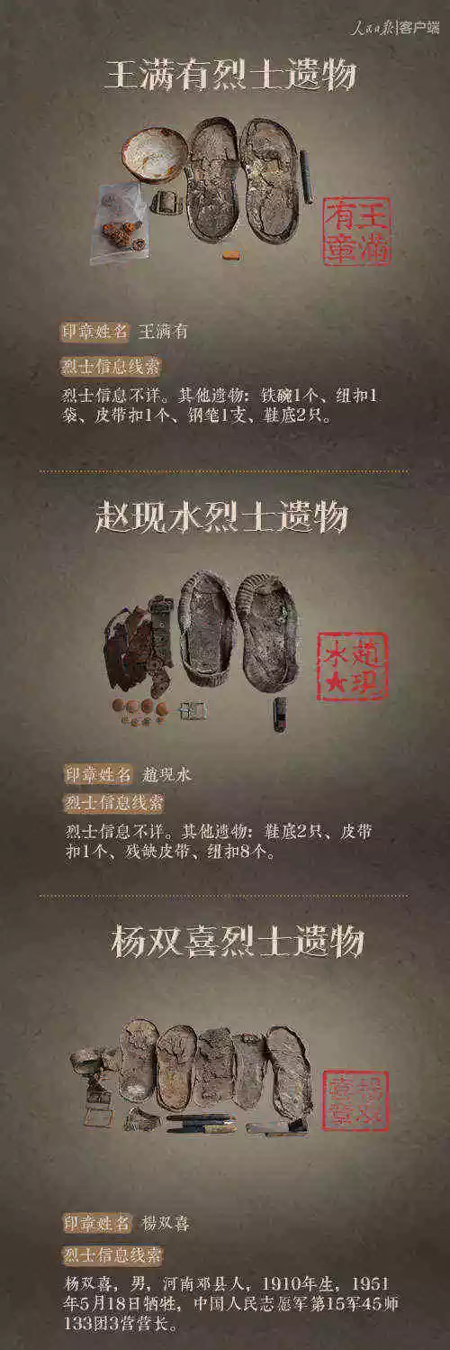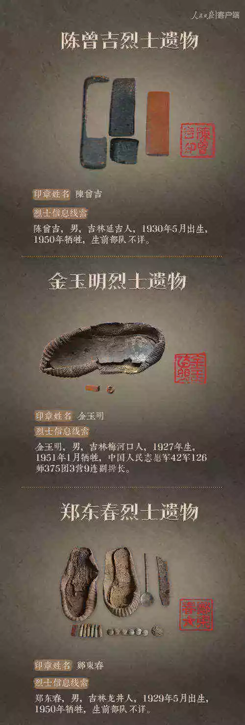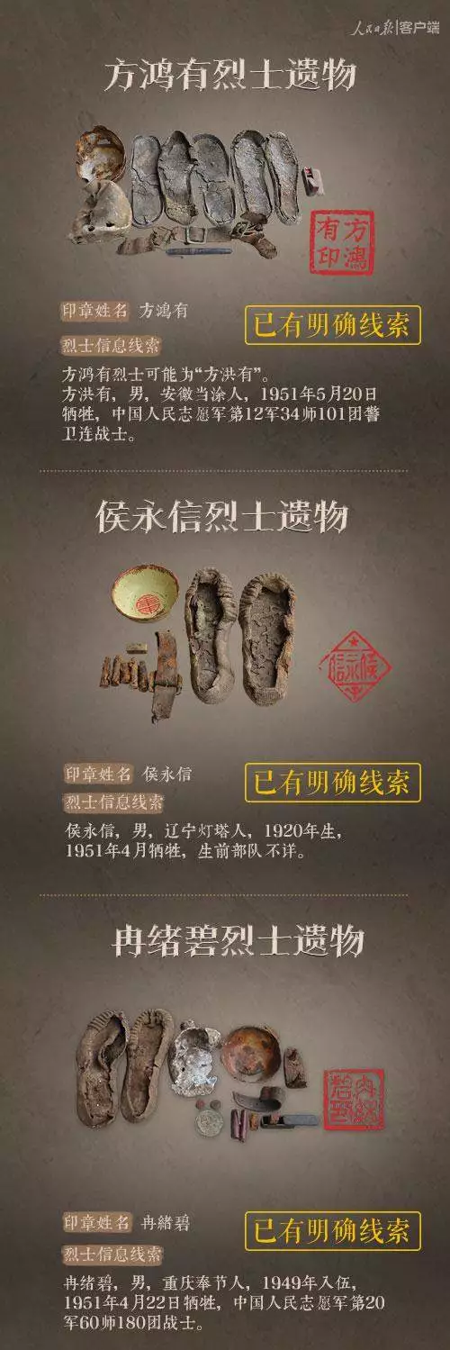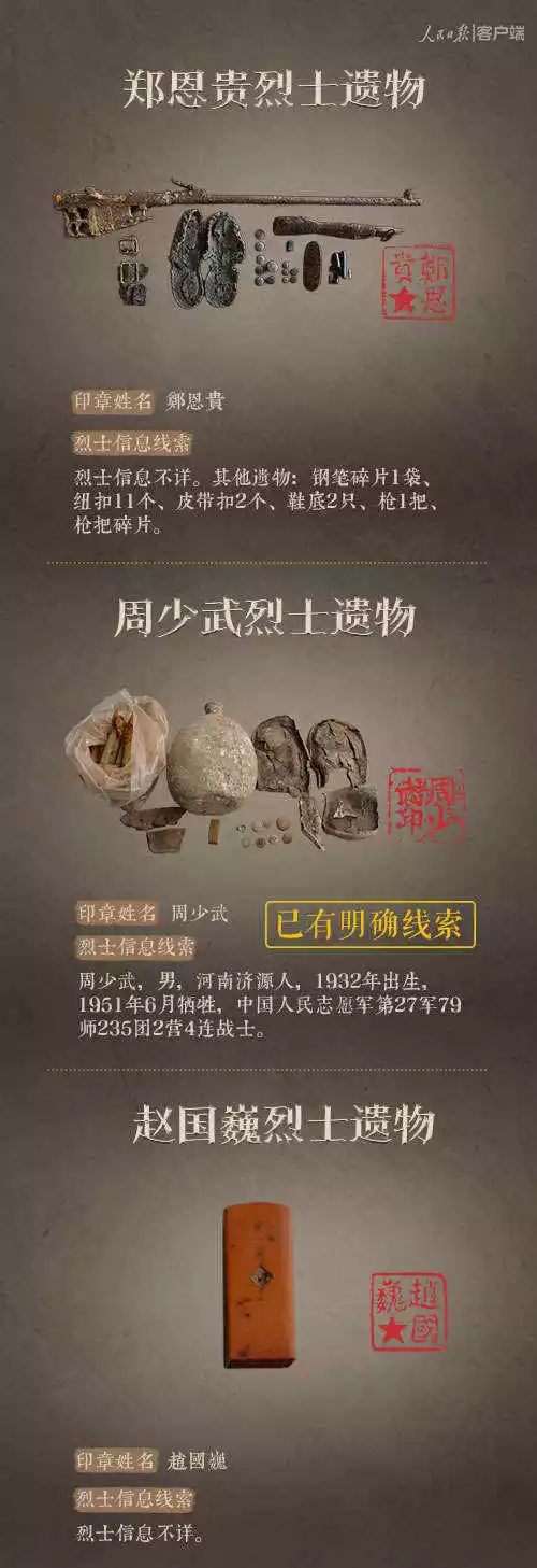 2014年以來,先后有五批589位在韓志愿軍烈士遺骸回到祖國懷抱。退役軍人事務(wù)部從這些烈士的上千件遺物中,發(fā)現(xiàn)了姓名文字圖案清晰可見的24枚印章。近日與人民日報新媒體等共同發(fā)起#尋找英雄#媒體行動,向全社會征集這24位烈士親屬線索。3月29日,人民日報客戶端、法人微博、微信公號同時發(fā)布稿件《當(dāng)年,他們?yōu)槲覀儬奚?;今天,請為他們做一件事》,向社會介紹“尋找英雄”活動,并公布24位烈士的基本情況和遺物信息。