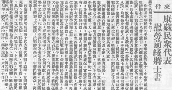 圖為《新華日報》載“康藏民眾代表慰勞前線將士書” 圖片由喜饒尼瑪提供
