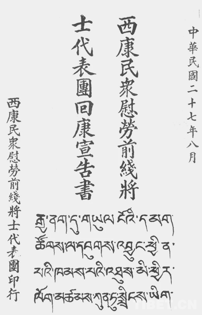 圖為《西康民眾慰勞前線將士代表團敬告將士書》封面 圖片由喜饒尼瑪提供