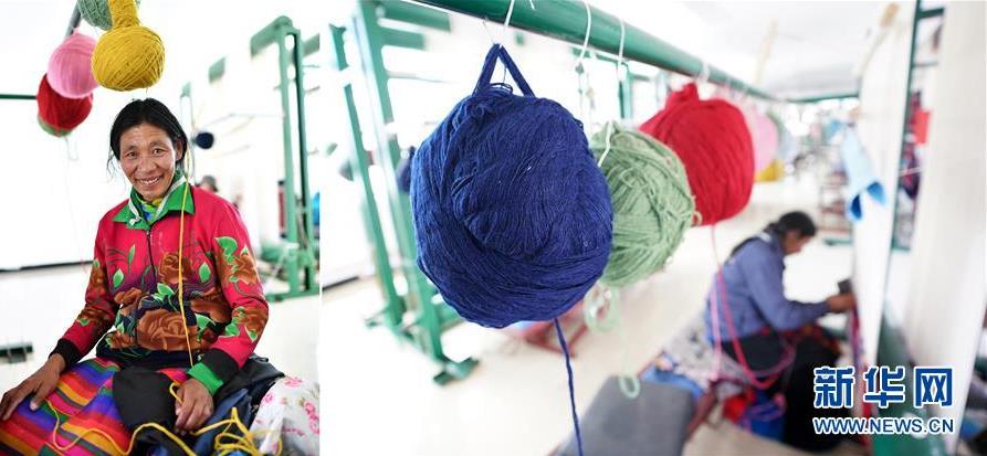 拼版照片:左圖為西藏阿里地區(qū)改則縣物瑪鄉(xiāng)村民央卓在噶爾縣康樂新居服裝地毯加工廠;右圖為央卓在噶爾縣康樂新居服裝地毯加工廠工作。2017年,央卓和家人從改則縣物瑪鄉(xiāng)搬遷到噶爾縣康樂新居易地扶貧搬遷安置點,住進了125平方米的新居。2018年7月,央卓和女兒參加了康樂新居服裝地毯加工廠的培訓(xùn),在家門口找到了工作(7月25日攝)。 新華社記者 詹彥 攝