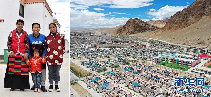 拼版照片:左圖為西藏阿里地區(qū)日土縣東汝鄉(xiāng)阿汝村村民丹木真(中)和妻子扎西拉姆(左)、女兒南嘎曲增(右)、小女兒列旺桑姆在噶爾縣康樂新居易地扶貧搬遷安置點;右圖為噶爾縣康樂新居易地扶貧搬遷安置點一角(無人機照片)。2018年,丹木真和家人搬遷到噶爾縣康樂新居易地扶貧搬遷安置點,告別了村里土木結(jié)構(gòu)的舊房子,住進了150平方米的新居。安置點內(nèi)醫(yī)務(wù)室、幼兒園、活動中心等設(shè)施齊全,和丹木真一家一樣,從阿里地區(qū)改則縣、措勤縣、革吉縣等地搬遷來的2000多名群眾在這里過上了安居樂業(yè)的幸福生活(7月25日攝)。 新華社記者 詹彥 攝
