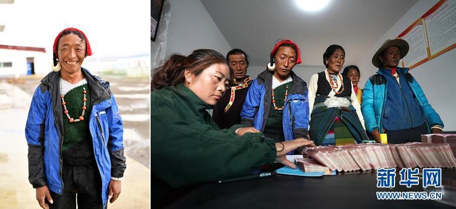拼版照片:左圖為西藏日喀則市定日縣克瑪鄉(xiāng)幫布村村民阿羅;右圖為阿羅在幫布村牦牛養(yǎng)殖農(nóng)民專業(yè)合作社領(lǐng)工資。2019年,阿羅把家里的100多只羊入股了合作社享受分紅,自己也加入了合作社負(fù)責(zé)放羊,每個月有3000元的收入(7月31日攝)。 新華社記者 詹彥 攝