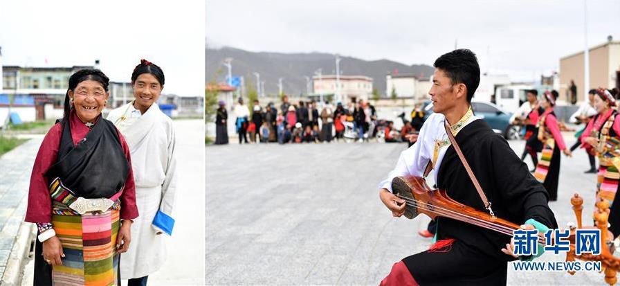 拼版照片:左圖為西藏日喀則市拉孜縣查務(wù)鄉(xiāng)明瑪村村民倉瓊(左)和兒子群培次仁;右圖為拉孜縣民間藝術(shù)團在明瑪村易地搬遷點為村民表演。明瑪村舊村交通不便,資源匱乏,自然環(huán)境惡劣,發(fā)展和脫貧受到制約。2016年,當(dāng)?shù)卣?jīng)多次規(guī)劃研究,在征求村民意見后,確定將明瑪村整村搬遷。2016年10月,倉瓊和家人搬遷到了明瑪村新村。新村交通便利,文化休閑廣場、活動室、學(xué)校等基礎(chǔ)設(shè)施完善。倉瓊和家人商量后,在新村開了一家小商店,一年有1萬多元的收入,再加上村里養(yǎng)殖專業(yè)合作社的分紅,倉瓊一家的日子越來越好(8月2日攝)。 新華社記者 詹彥 攝
