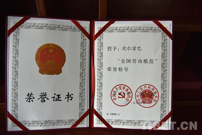 圖為次仁宗巴2015年獲得的“全國勞動(dòng)模范”榮譽(yù)稱號(hào)證書 攝影:王媛媛