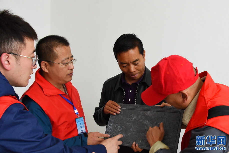 康馬縣縣長扎西多布拉給前來參觀的網(wǎng)絡(luò)正能量人士介紹工藝品(9月16日攝)。新華網(wǎng) 張宸攝