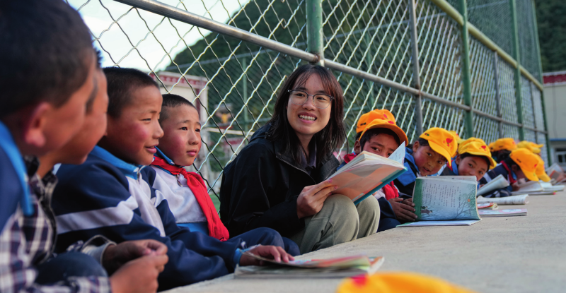 在西藏林芝市工布江達(dá)縣娘蒲鄉(xiāng)中心小學(xué),嶺南師范學(xué)院支教隊(duì)隊(duì)員涂建枝在晚自習(xí)前和孩子們一起溫習(xí)功課(2024年9月3日攝)劉洲鵬攝/本刊