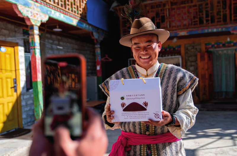 在西藏日喀則市定結(jié)縣陳塘鎮(zhèn),自媒體博主夏爾巴人旦增在拍攝視頻推介當(dāng)?shù)靥禺a(chǎn)雞爪谷糌粑(2024年12月13日攝)丁增尼達(dá)攝/本刊