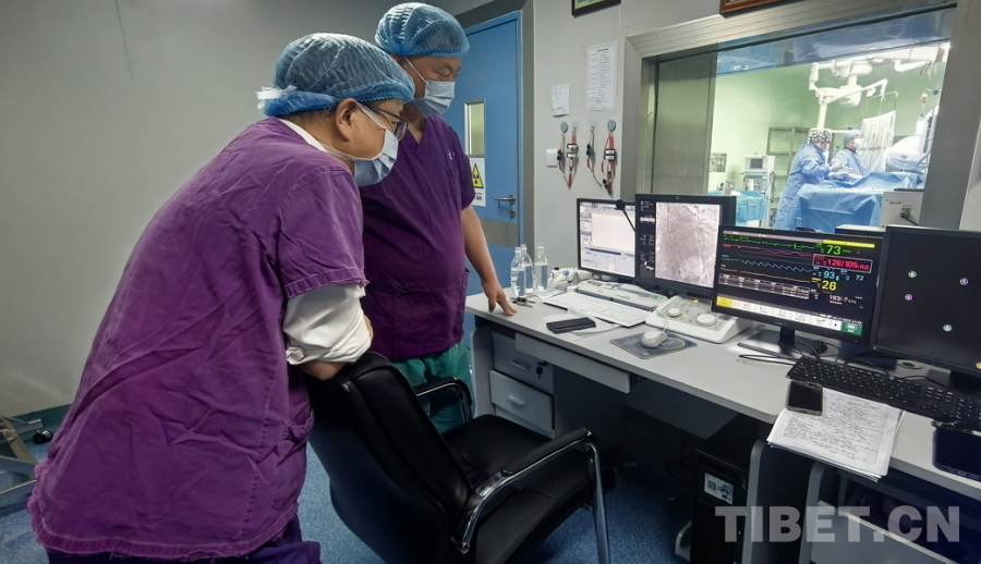 圖為陰赪茜(手術(shù)室內(nèi)右)趕赴阿壩州人民醫(yī)院手術(shù)救治急性心?;颊?,屏幕上顯示出陰赪茜正操作纖細(xì)的導(dǎo)絲嘗試通過患者發(fā)生閉塞的心臟血管 攝影:劉莉