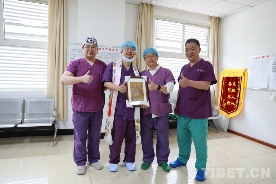 圖為陰赪茜(左二)趕赴阿壩州人民醫(yī)院救治急性心?;颊呤中g(shù)成功后,阿壩州人民醫(yī)院院長(zhǎng)、主任醫(yī)師楊林(右二),心內(nèi)科主任、主任醫(yī)師李方安(右一),心內(nèi)科主治醫(yī)師孫壘向陰赪茜獻(xiàn)上哈達(dá)并合影 攝影:劉莉