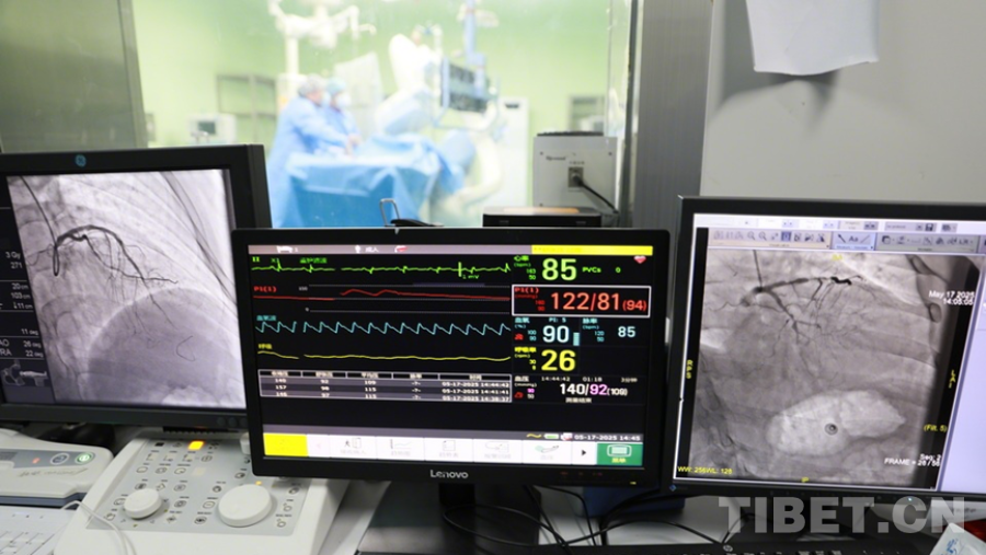 圖為陰赪茜(手術(shù)室內(nèi)右)趕赴阿壩州人民醫(yī)院手術(shù)救治急性心?;颊撸ㄟ^比對(duì)屏幕上的畫面,術(shù)后(左側(cè)屏幕)患者的心臟血管血流已較術(shù)前明顯恢復(fù) 攝影:劉莉