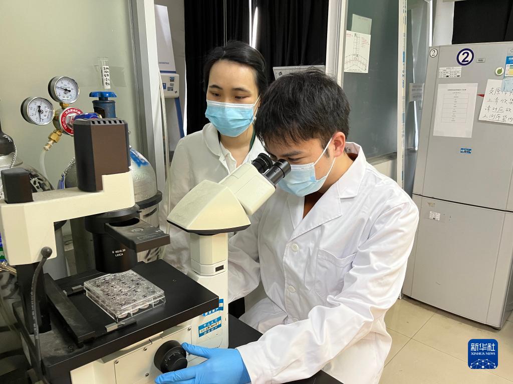 10月20日,廣東中山大學(xué)中山醫(yī)學(xué)院博士研究生張賢濤(右)在實驗室。新華社發(fā)