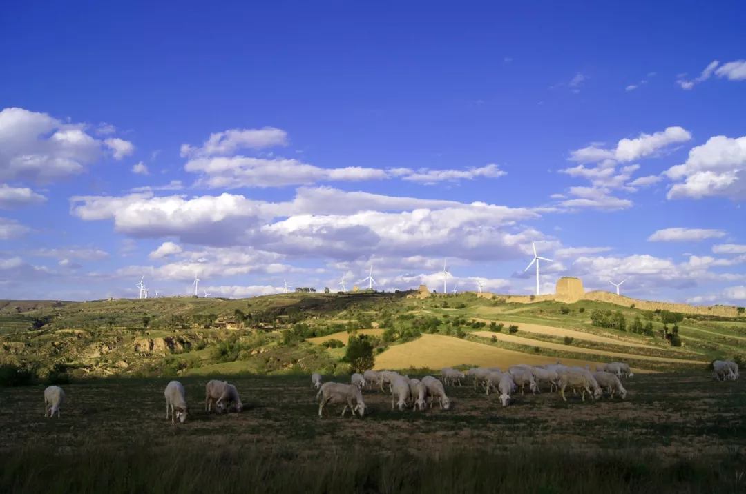 在山西省右玉縣小五臺(tái)風(fēng)力發(fā)電廠附近,當(dāng)?shù)啬撩穹硼B(yǎng)的羊群在吃草(2012年6月12日攝)。新華社記者 燕雁 攝