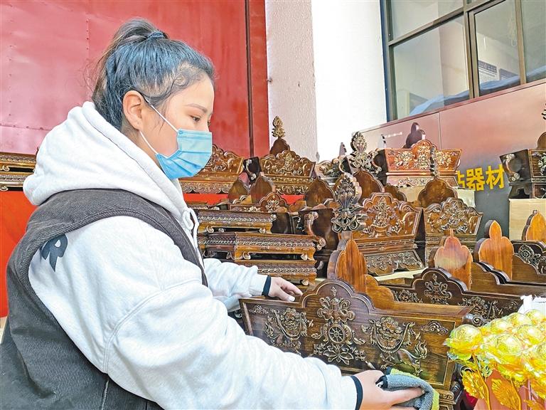 來自山南市貢嘎縣的拉吉帶著自家生產的“切瑪盒”第2次來到八廓商城年貨市場。“由于是自家生產,所以我們自主設計了一款線條稍微簡約的‘切瑪盒’;還有一款傳統(tǒng)線條與圖案的‘切瑪盒’。在顏色上,我們選擇了較為持重的深色,這樣的顏色大氣沉穩(wěn),許多市民非常喜歡,兩款售價都是380元。”拉吉介紹道。