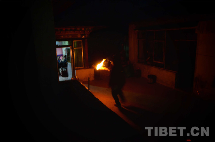 酒足飯飽后,“驅(qū)鬼”儀式開始。家人們一起各自用糌粑從頭到腳觸碰一遍、捏下手印后,與故意吃剩的一點古突扔進(jìn)驅(qū)鬼盤,寓意將身心中的病痛與不詳全部拋掉。隨后查斯點燃火把,一邊喊著“所有妖魔都出去”,一邊手持火把跑往所有屋子各掃幾下,拿著火把和驅(qū)鬼盤到交叉路口焚燒掉。一路狂奔,且不能回頭。