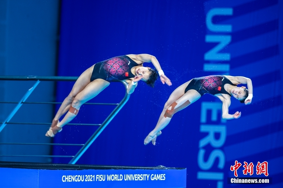 7月31日,在成都簡陽市文體中心游泳館舉行的第31屆世界大學(xué)生夏季運(yùn)動會跳水女子雙人10米跳臺決賽中,中國組合張家齊/掌敏潔以349.08分的成績獲冠軍。圖為張家齊(右)/掌敏潔在比賽中。中新社記者 劉忠俊 攝