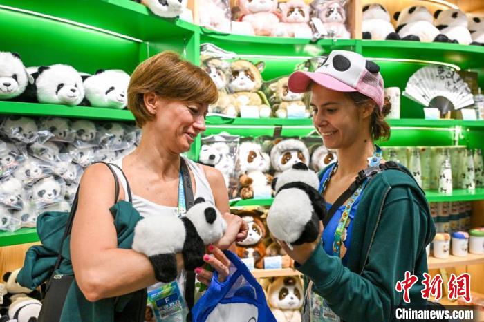 8月1日,成都大運(yùn)會(huì)期間,成都大熊貓繁育研究基地成為參賽代表團(tuán)的熱門打卡點(diǎn),圖為匈牙利選手凡妮(右)選購(gòu)大熊貓玩偶。中新社記者 趙文宇 攝