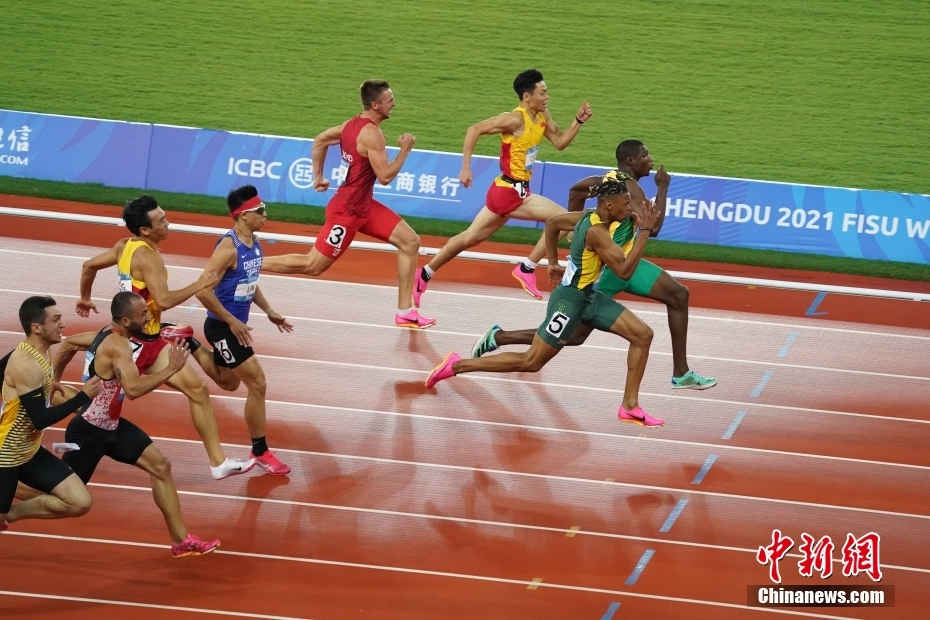 8月2日,第31屆世界大學(xué)生夏季運(yùn)動(dòng)會(huì)男子100米決賽在四川成都舉行,牙買加選手GOLDSON Kadrian dwayne(右一)以10秒04奪得男子百米冠軍。