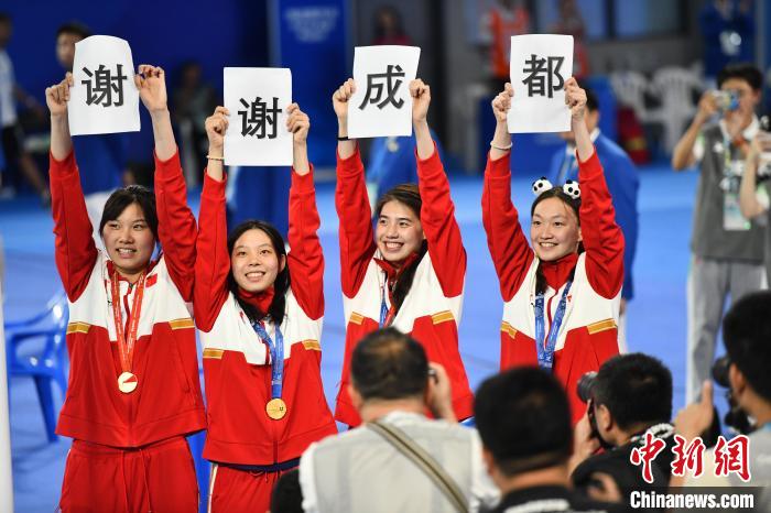 當(dāng)四位中國女將高高舉起“謝謝成都”四個大字,成都東安湖體育公園游泳跳水館沸騰了。7日晚,中國大學(xué)生游泳隊(duì)運(yùn)動員柳雅欣、朱蕾桔、張雨霏和李冰潔在頒獎儀式后拿出了這份特別的禮物:感謝觀眾的陪伴與支持,也感謝成都的熱情與包容。