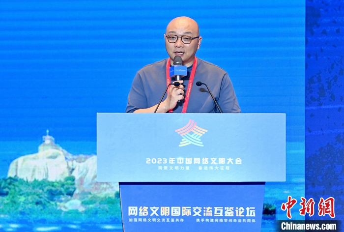7月18日,2023年中國網(wǎng)絡文明大會網(wǎng)絡文明國際交流互鑒論壇在廈門舉辦。圖為完美世界首席執(zhí)行官蕭泓作主題演講。中新社記者 王東明 攝