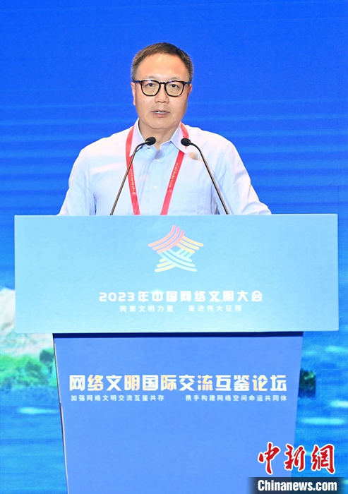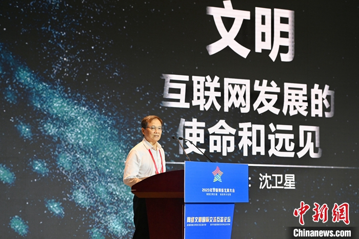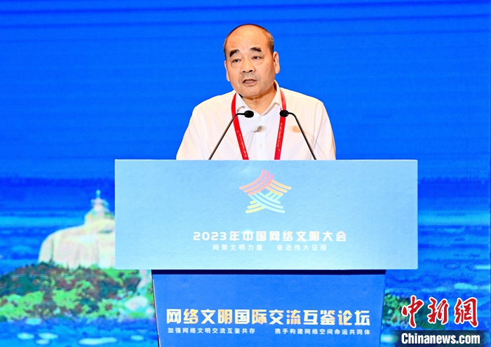 7月18日,2023年中國網(wǎng)絡文明大會網(wǎng)絡文明國際交流互鑒論壇在廈門舉辦。圖為光明日報原副總編輯、浙大城市學院文明與傳播研究院研究員沈衛(wèi)星作主題演講。中新社記者 王東明 攝