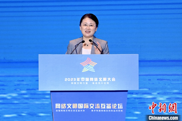 7月18日,2023年中國網(wǎng)絡文明大會網(wǎng)絡文明國際交流互鑒論壇在廈門舉辦。圖為江蘇省蘇州市委網(wǎng)信辦主任陳雪嶸作主題演講。中新社記者 王東明 攝
