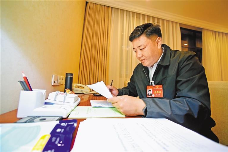 圖為全國人大代表拉瓊在會(huì)前完善發(fā)言材料。