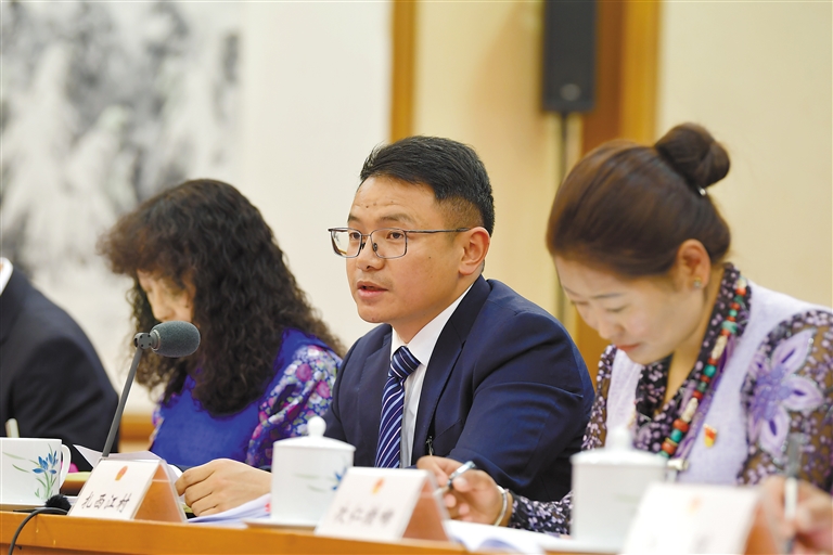 3月5日下午,十四屆全國(guó)人大二次會(huì)議西藏代表團(tuán)舉行全體會(huì)議,審議政府工作報(bào)告。圖為來(lái)自隆子縣斗玉珞巴民族鄉(xiāng)的全國(guó)人大代表扎西江村在西藏代表團(tuán)審議時(shí)發(fā)言。記者 旦增西旦 攝