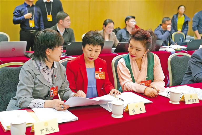 3月5日,全國(guó)政協(xié)十四屆二次會(huì)議分界別討論政協(xié)常委會(huì)工作報(bào)告和提案工作情況報(bào)告,住藏全國(guó)政協(xié)委員緊緊圍繞兩個(gè)報(bào)告,結(jié)合西藏政協(xié)工作實(shí)際,在小組討論中積極履職建言。圖為住藏全國(guó)政協(xié)委員卓嘎(左)和朗杰拉措(右)在會(huì)議結(jié)束后討論交流。