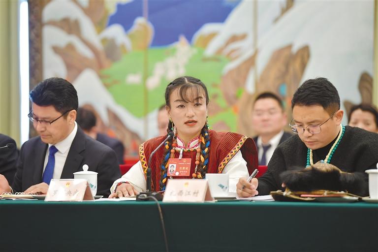 圖為3月6日下午,十四屆全國(guó)人大二次會(huì)議西藏代表團(tuán)舉行團(tuán)組開放活動(dòng)。46家中外媒體的80余名記者前來采訪。圖為全國(guó)人大代表羅布央宗(中)在現(xiàn)場(chǎng)回答記者提問。 本報(bào)記者 旦增西旦 張思雨 攝