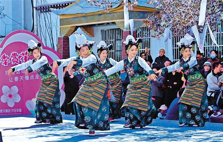 3月27日,“繁花映彩 共繪幸?!笔讓梦幕囆g(shù)周暨 “3·28”西藏百萬農(nóng)奴解放紀念日活動在拉薩市城關(guān)區(qū)軍民路開幕。圖為活動現(xiàn)場歌舞表演。記者 王敏 攝