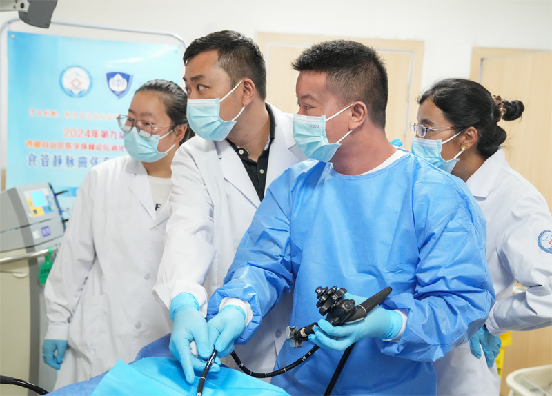7月8日,在西藏日喀則市人民醫(yī)院,第九批醫(yī)療人才“組團(tuán)式”援藏專(zhuān)家、復(fù)旦大學(xué)附屬中山醫(yī)院內(nèi)鏡中心副主任醫(yī)師胡健衛(wèi)(左二)指導(dǎo)徒弟張武(左三)進(jìn)行內(nèi)鏡手術(shù)。新華社記者 丁汀 攝/新華社圖片庫(kù)