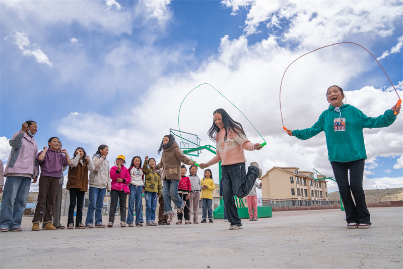 6月22日,西藏那曲市班戈縣中石化小學(xué)學(xué)生在操場(chǎng)上跳繩。作為目前全國(guó)海拔最高的援藏小學(xué),班戈縣中石化小學(xué)有“離天空最近的援藏小學(xué)”之稱(chēng)。新華社記者 丁增尼達(dá) 攝/新華社圖片庫(kù)