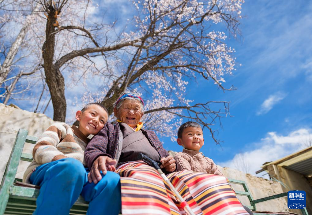 次仁桑姆(中)和兩位晚輩在宗卡村家中的院子里聊天(3月26日攝)。新華社記者 晉美多吉 攝