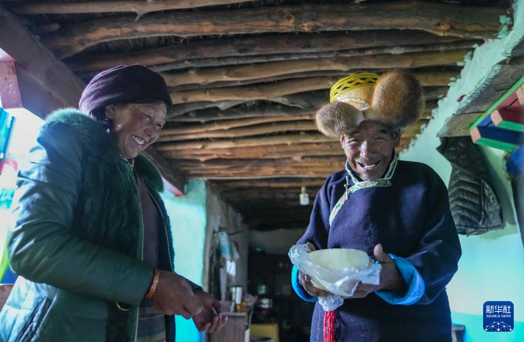 白瑪扎西(右)從冰柜中取出準(zhǔn)備做茶用的酥油(3月26日攝)。