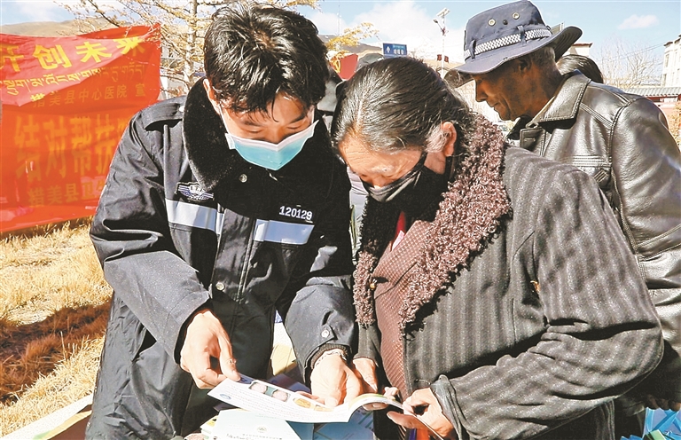 措美縣紀(jì)念西藏百萬(wàn)農(nóng)奴解放67周年活動(dòng)中,黨員干部為群眾發(fā)放宣傳手冊(cè)。
